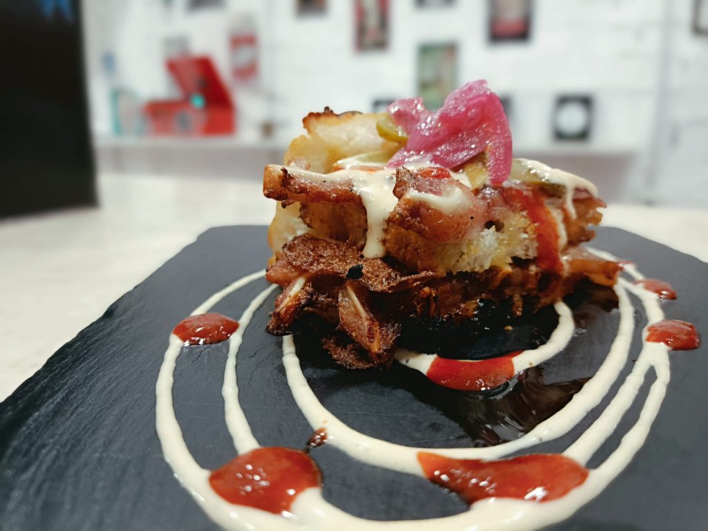 Plato: Taco de oreja de cerdo coronado con cebolla caramelizada, aderezado con salsa brava y toque de alioli, en tortilla de harina de trigo.