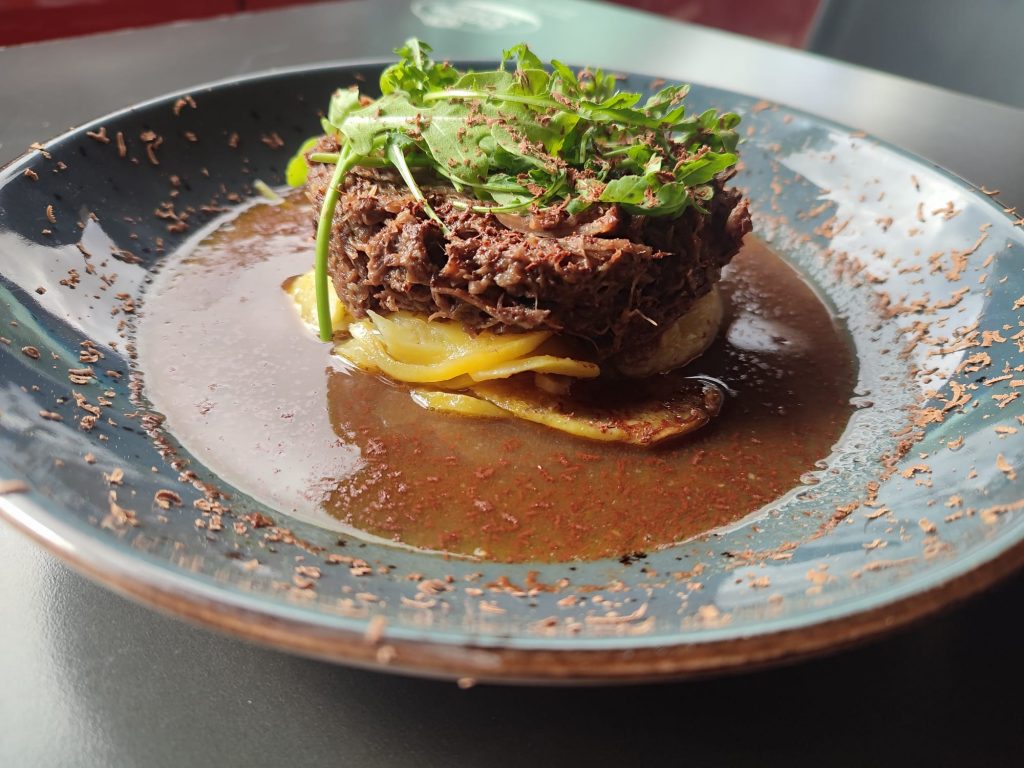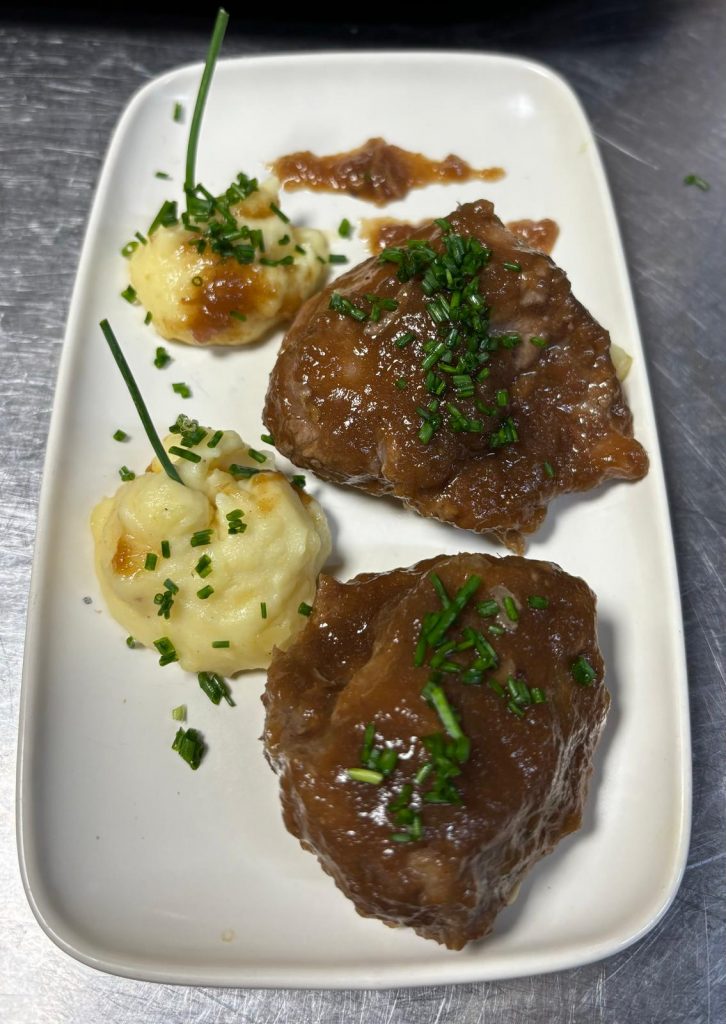 Plato: CARRILLADA IBÉRICA CON SU REDUCCIÓN Y PARMENTIER( carrillada ibérica, patata y comino) 16€