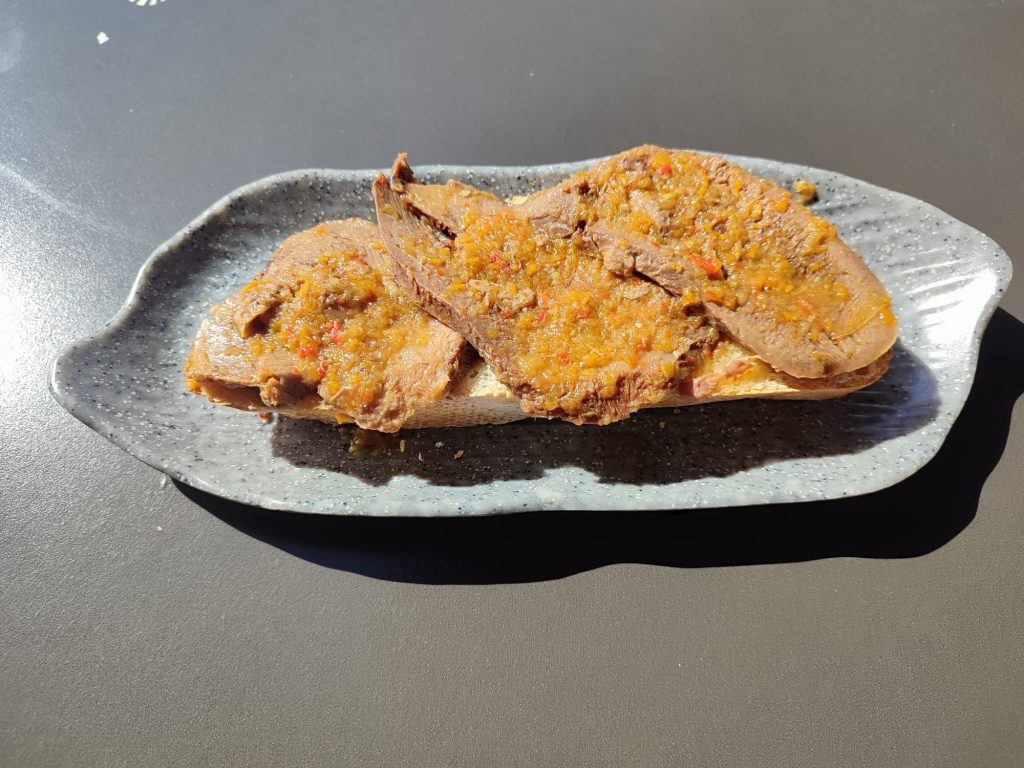 Tapa Focaccia de Minutejos Oreja cocida,Confitura de tomate, ajo, albahaca, aove…….