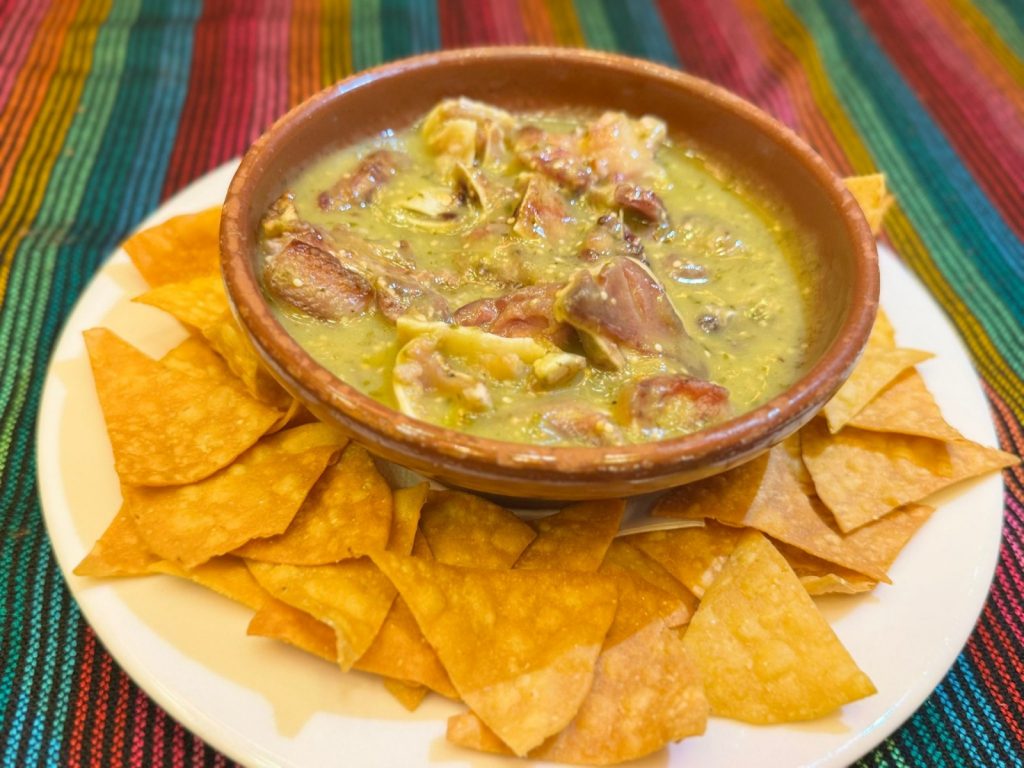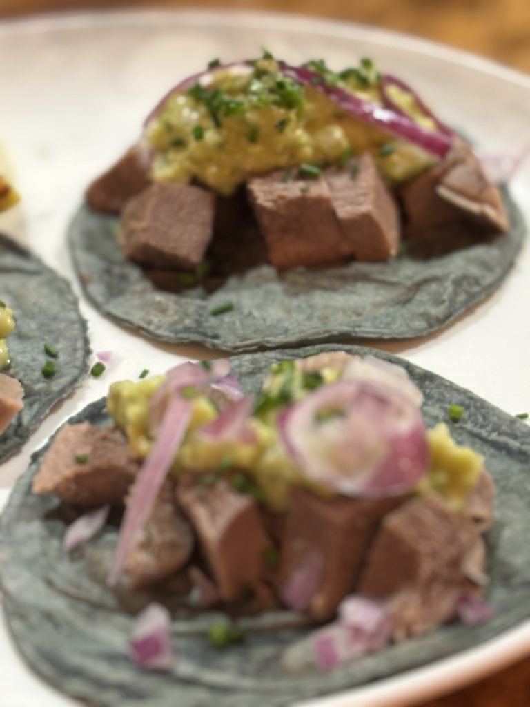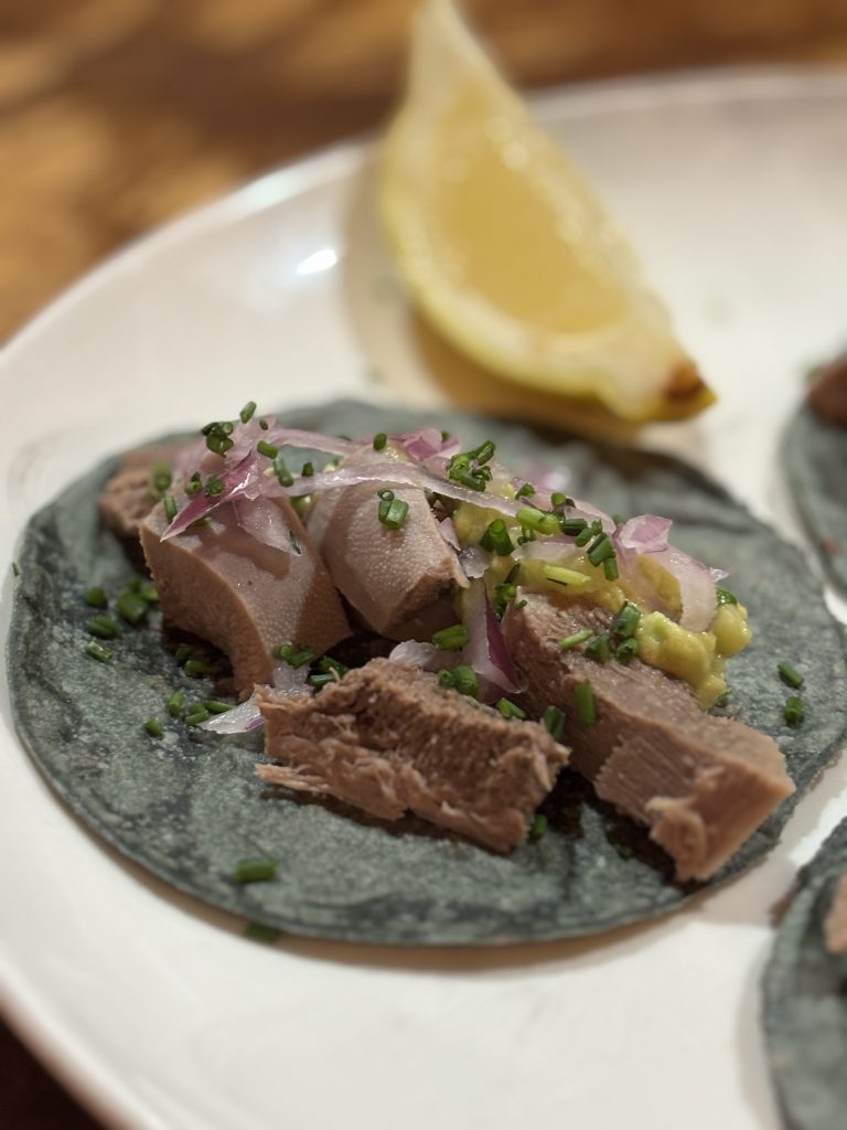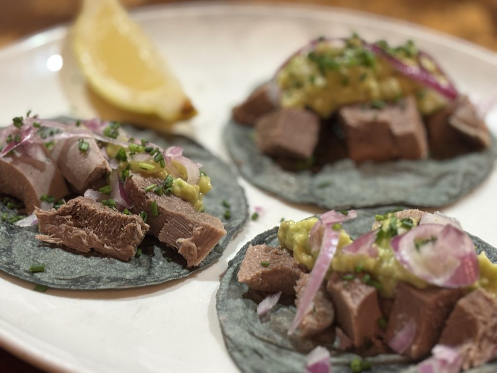 Plato: Taco de lengua de res al tequila. coronado con cebolla roja encurtida, cilantro y guacamole sobre tortilla de maíz azul.